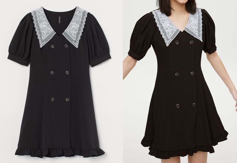 今年大流行的娃娃领,搭配全黑的裙子,不会显得太甜美,设计恰到好处。下摆是荷叶边设计,衬一双简单的平底鞋便可以出门。