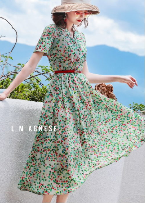 绿色,也是夏日的代表色系。这一款纱裙在原有的大裙摆基础上采用了独特的收腰、垫肩设计,让服装整体呈现的修身效果更佳,不仅显瘦而且更显高挑。撞色碎花设计也让衣服从整体视觉上呈现得更加饱满有趣。清风暖阳间,不自觉地将春色也带入了夏季,在街头巷尾处留下你清冽的身影。