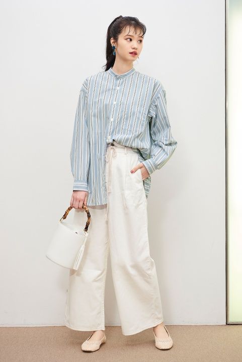 裤款采用了十分流行的亚麻混纺质地。配合直筒轮廓,及腰部的橡筋设计,穿起来十分舒适。