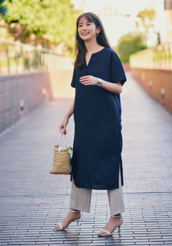 拥有直筒版型的连身裙,带给人轻快凉爽的视觉效果。亚麻质地服饰是夏季的热门单品,营造自然不造作的洒脱风格。