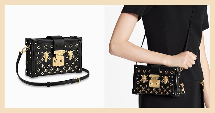 经典小牛皮「盒子包」,缀有金属标志和Monogram,配有可拆式皮革肩带,可手提或肩背。