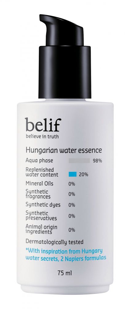 belif 匈牙利女王保湿水精华能启动肌肤水润系统,有效维持肌肤水润及弹性,维持水油平衡,同时强化肌肤防御能力,让肌肤获得舒缓,让肌肤柔滑细致。主要成份有迷迭香、鼠尾草、香蜂草、玫瑰等植萃精华。使用爽肤水后,取适量涂抹於面部及颈部,按摩至吸收。在其他精华液前使用,再上妆令妆效贴服自然。