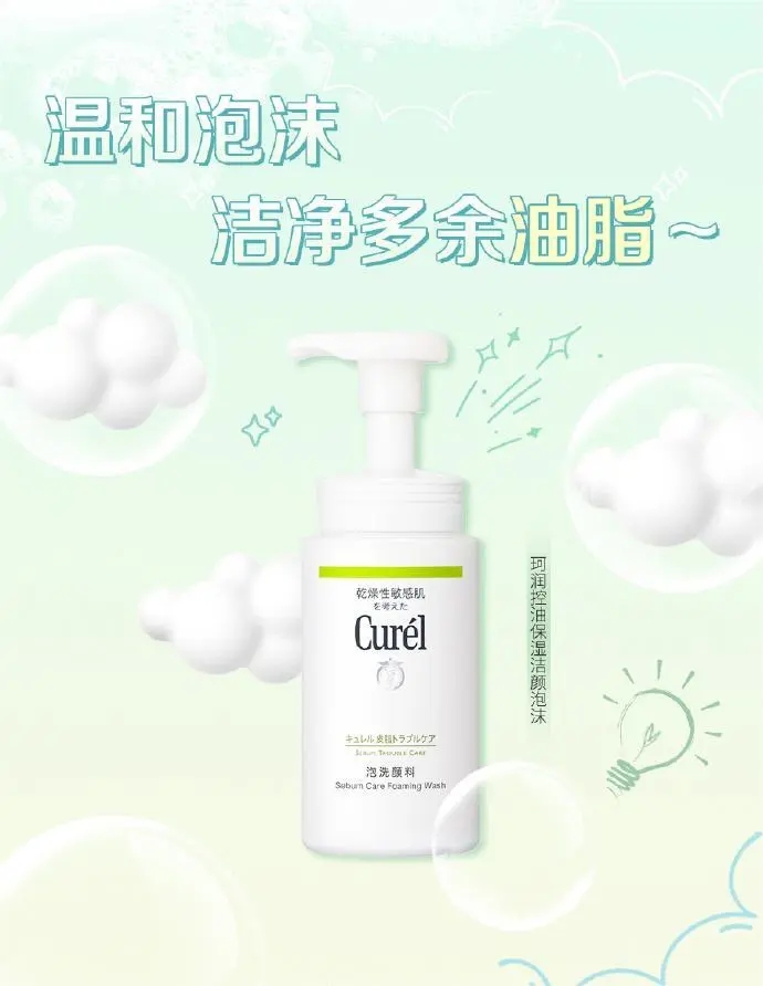 Curél珂润控油保湿洁颜泡沫,含油脂溶解成分,一按既出的丰富细腻泡沫,充分洗净毛孔污垢及多余皮脂的同时不会带走肌肤的滋润度。保持与健康肌肤PH值相同的弱酸性,温和守护肌肤自身“神经酰胺”。 洗后水润不紧绷,保持肌肤水油平衡。