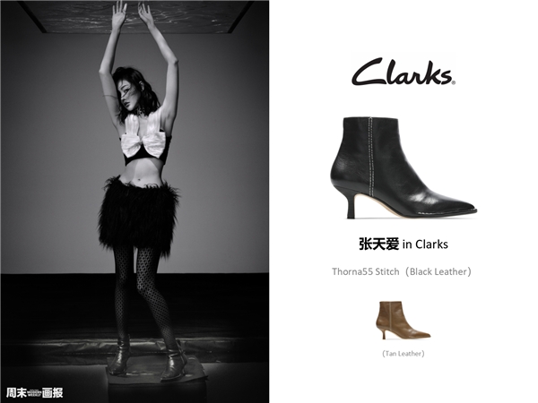 剪掉一头长发的张天爱在最新造型大片中真切地显露出更纯粹坚定的女性力量。花纹丝袜、羽毛短裙搭配Thorna55 Stitch 经典黑色裸靴,简约流畅鞋型和尖头设计拉长腿型,让原本就有大长腿优势的张天爱更美艳动人。胸前超大白色蝴蝶结与鞋款上的白色缝线互相呼应,为全黑look带来点睛之笔,搭配光滑牛皮鞋面更显潮酷质感。简约高级的廓形配合精湛的车缝工艺,完美诠释干练优雅的女性魅力。
