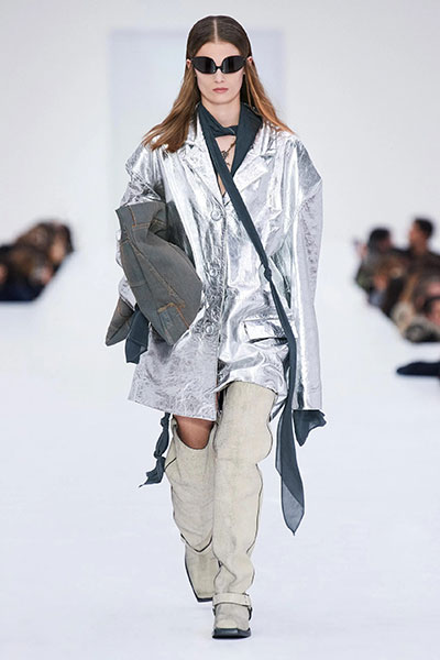 其他值得留意的中央包括带有祖母花卉的簇绒衬里、或有绗缝的奢华毯子连衣裙、镶嵌有水晶的罗纹袜靴、陈旧的褪色针织单品、分层流苏式连衣裙、以及重复回归的后 Talking Heads 时期方形西装外套。这些外套采用复染皮革制成,这也是 Acne Studios 的另一个早期标志。此外,本着循环再造的肉体,此次秀场上座椅所用的人造毛皮将重新用于行将推出的服装系列,其他局部将捐给巴黎时装学校 Studio Berçot。