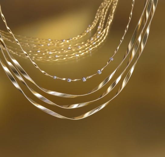 恍如穿越神秘沙丘,霎那间巧遇惊艳花丛。Marrakech Onde 副系列是 Marco Bicego 标志性 Marrakech系列的延伸,珠宝设计重新演绎经典的 18K 手织黄金弦线 「The coil工艺」, 打造出独特不规则的波浪椭圆形。变幻多姿的线条勾勒出层层沙丘,尽显神秘莫测的自然韵味;盈盈钻石与金色线条精巧交织,宛若绿洲间盛放朵朵闪耀之花,孕育出流光溢彩的手工技艺,映衬着女性时尚优雅的动人气质。涟漪线条在光影间自在流动,晶莹之花凝固生命的靓丽姿态,赋予日常别具一格的感官之美。