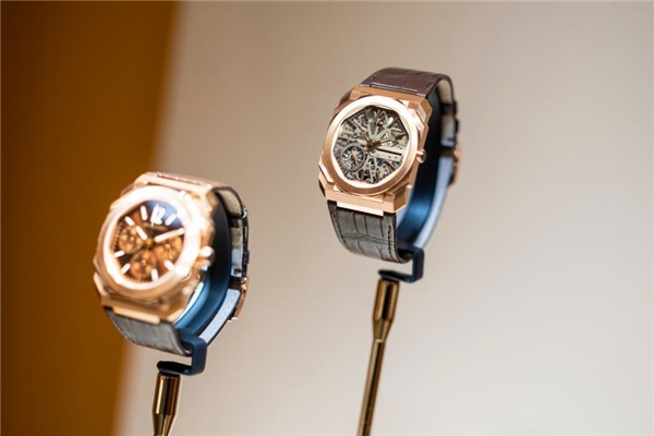 此次重磅展出的宝格丽Octo Finissimo镂空腕表8日链沿袭Octo系列精神内核,至臻设计极具雕塑美感,精巧的八角形18K玫瑰金表壳与蓝宝石表背巧妙搭配。纤薄的BVL 199 SK机芯拥有令人赞叹的8天动力储存,并通过环绕7点半位置小秒针盘的量尺造型指示器清晰显示。镂空设计让精密机芯与腕表充满现代建筑风格的几何线条呼应,18K玫瑰金时标凸显出喷砂处理哑光炭灰色结构的优雅风格,呈现出充满力量又轻盈洒脱的独特魅力。